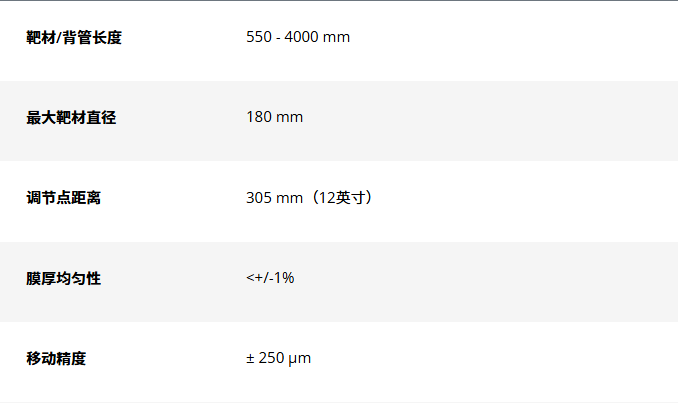 兼容所有SCI的端头,适用于125mm内径的靶材。RAM-Bar™允许调整位置之间的垂直差异达4mm,可实现精确调节。同时可将均匀性控制在+/-1%以内。